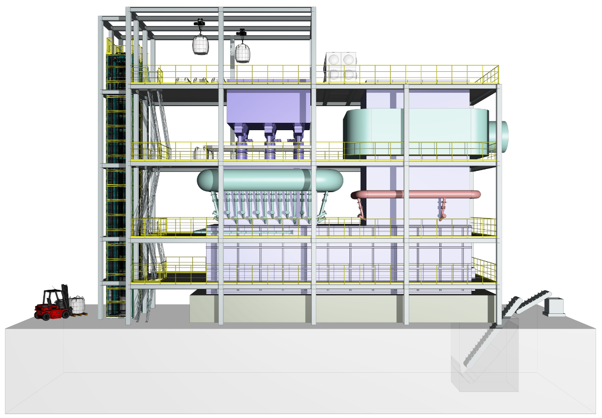 SRF氣化焚燒爐采用設(shè)置立式U型結(jié)構(gòu),進(jìn)料口在焚燒爐位于窯頭上方的氣化反應(yīng)塔頂部,由輸送裝置將SRF經(jīng)雙鐘罩密封進(jìn)料送入爐內(nèi);煙氣出口在焚燒爐位于窯尾上方的上升煙道出口,助燃風(fēng)進(jìn)口位于反應(yīng)塔中下部、熔池和上升煙道處,將SRF燃燼、熔融。